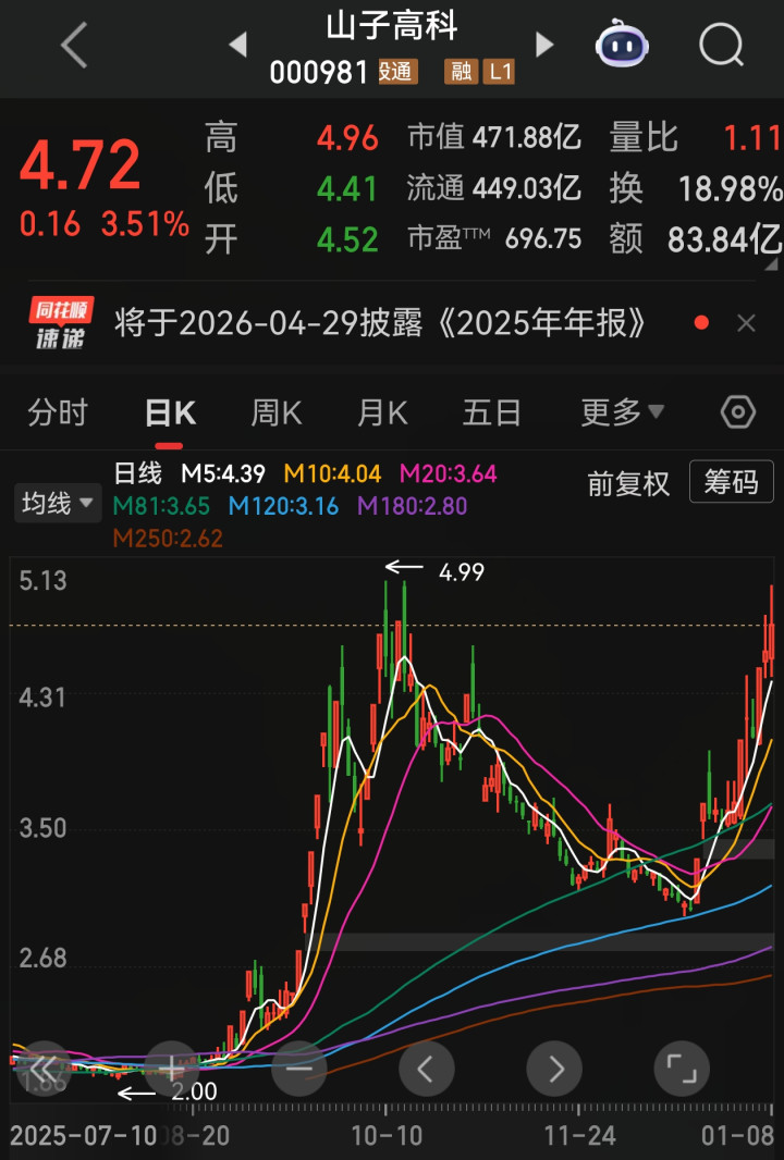近日山子高科算是一匹让人眼前一亮的黑马。股价从低位慢慢往上爬,一路震荡走高,尤其是最近几个交易日,就算没有板块行情的助攻,也能走出独立强势的走势,一度还想冲击涨停板,看得不少股民心里直痒痒。但眼瞅着股价逼近4.99元的前期高点,这只热门股却有点“脚步放缓”,连续两天在高位徘徊不前,到底能不能一举突破这个关键压力位,成了大家最关心的问题。