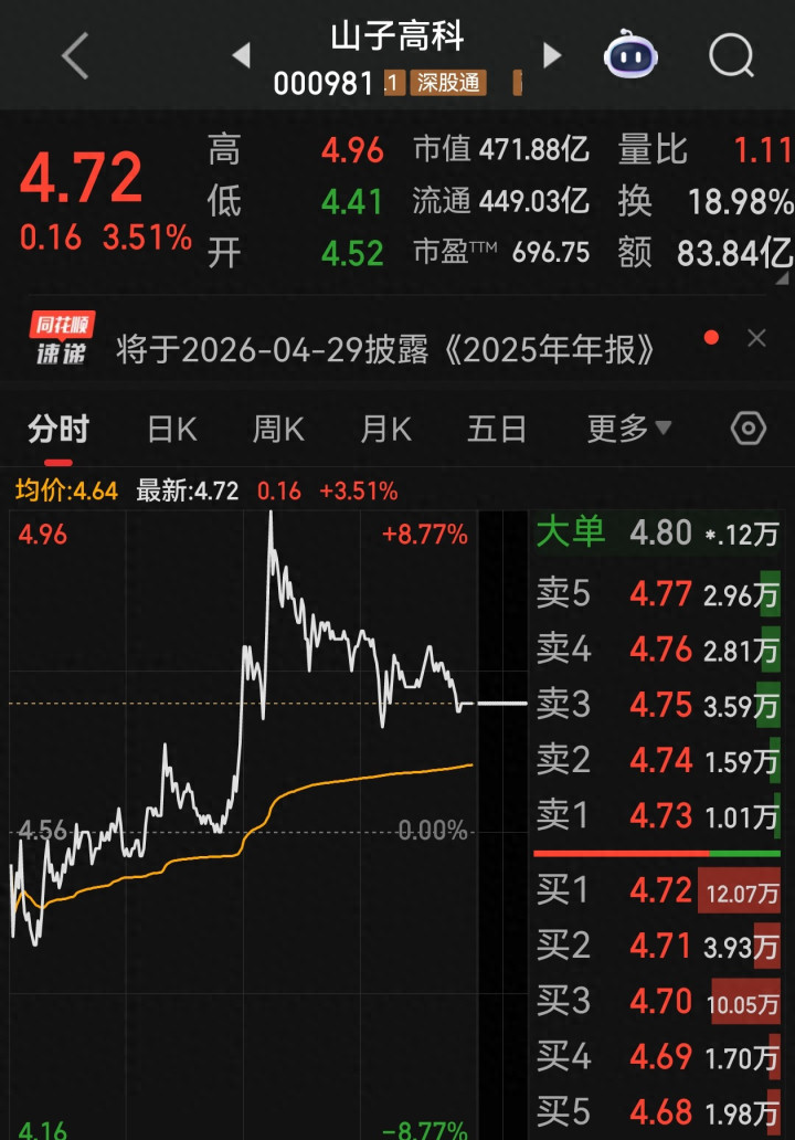 从今日走势上看,山子高科也在悄悄蓄力。股价最高冲到了4.96元,离4.99元的前高只有一步之遥,最终收在4.72元,上涨3.51%,全天成交量达到1805.48万,成交额更是高达83.84亿元,这么大的量能说明市场关注度极高,承接力也很足。前一天的冲高回落,看似是承压回调,其实更像是主力在清洗浮筹——把那些不坚定的投资者震出去,既降低了后续拉升的成本,又完成了筹码交换,为突破前高储备弹药。