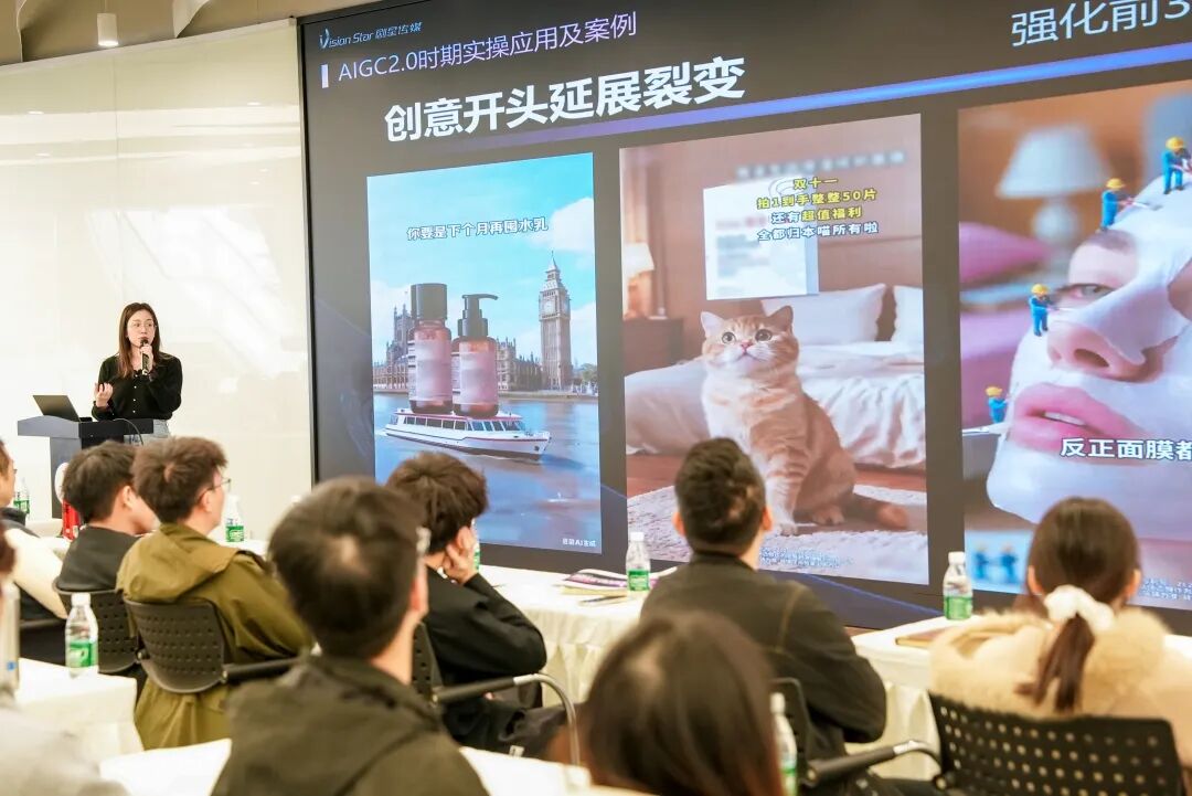 “未来的内容生产,一定会从‘人工经验驱动’,升级为‘AI数据驱动’的智能生产。”剧星传媒全国策略中心高级策略总监虞金蕾以《智创未来 赋能增长》为主题展开分享。她系统介绍了剧星传媒在AIGC素材生产方面的提效经验与创意解决方案,以实际案例解析如何通过AIGC技术,实现从品宣素材、投流素材到直播间素材的全链路覆盖,全面赋能剧星传媒“长-短-直”整合营销模式。“不是卷人力、卷成本、卷时效,剧星传媒更加重品塑、重品质、卷创意,推动内容生产进入智能提效、创意赋能的新阶段。”